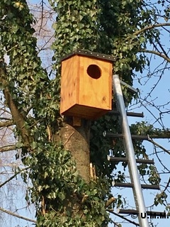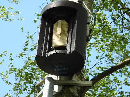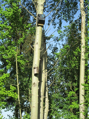 Einer Besiedlung waldbewohnender und am Wasser jagender Fledermäuse, wie Braunes Langohr, Rauhhautfledermaus, Bartfledermäuse, Abendsegler u. a., dürfte nichts mehr im Wege stehen. Auf freien Anflug haben wir geachtet und hoch genug hängen die Kästen. Bald geht es den Zuckmücken in den Kaupenwiesen an den Kragen.
