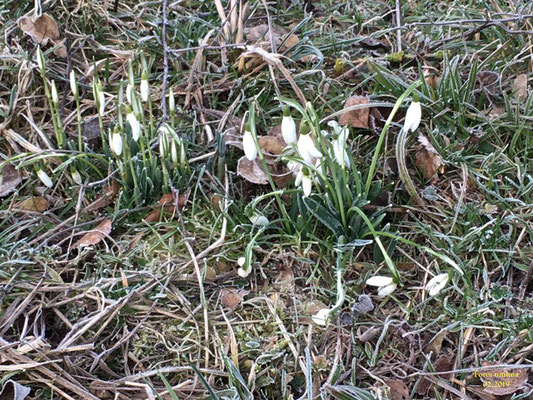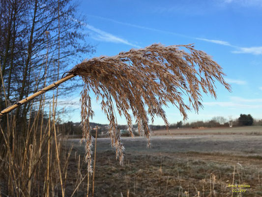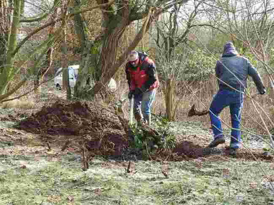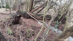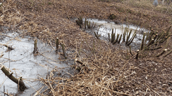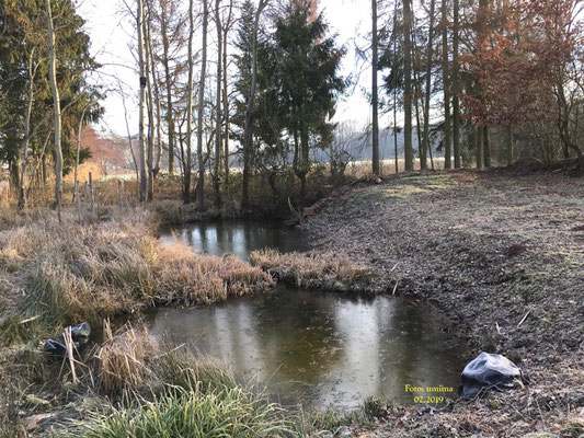 Sie sehen zwei gefrorene Senken auch "Himmelsteiche" genannt, da nur Regenwasser sie speist. Die schattigen Weiden sind abgeholzt, die Stubben noch herauszuziehen. Nach einer weiteren Sanierung, entfernen des Schlicks und Laubfalls, kann sich im Flachwasserbereich eine neue Amphibienpopulation ansiedeln.