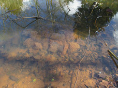 Hier eine Woche alter Grasfroschlaich im links von den Senken liegenden Teich.