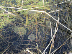 In den vom Bewuchs freigelegten Senken hat der Grasfrosch massig gelaicht. Erster Erfolg unserer Anstrengungen. Die besonnte Lage muss die Froschdamen überzeugt haben.