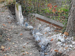 Das Entfernen der 23,6 m langen Betonmauer ist durch die starke Armierung und die enge Lage zu angrenzenden Bäumen besonders schwierig.