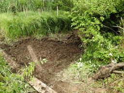 Nur den links von den Senken liegenden Teich hat im letzten Jahr Erdkröte und Grasfrosch für ihren Laich auserkoren. Unsere Aufgabe ist es, den Wasserzulauf freizuhalten und das Austrocknen zu verhindern.