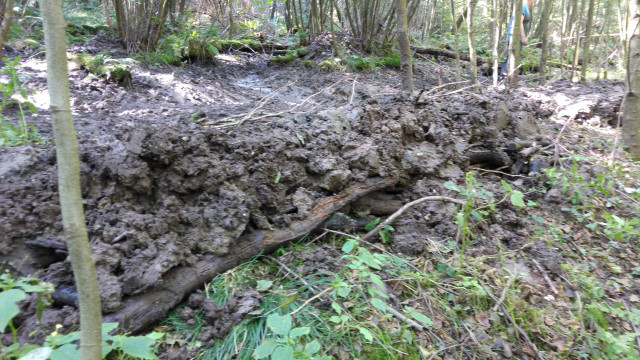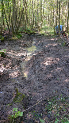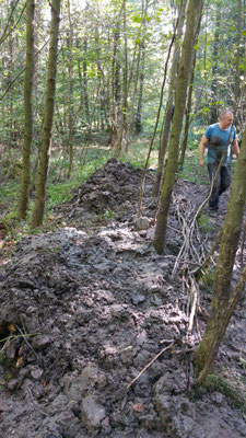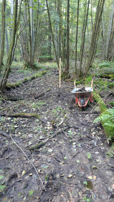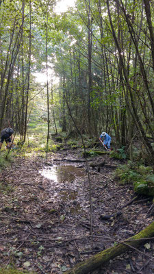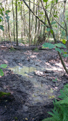 Wenn im Frühjahr Gras- und Springfrosch sowie Bergmolch im Feuchtgebiet des Kappenwaldes laichen, kann es passieren, das diese Laichplätze zu früh trocken fallen und der Laich verendet. Mit den Jahren verdrängte der Schlamm das Wasser. Daher entschlammten wir die Senken und verschaffen den Larven genug Zeit sich dahin zurückzuziehen und ihre Metamorphose zu beenden. Am Rande wartet für die erfolgreich geschlüpften Amphibien ein aus Schlamm und Ästen gebautes Versteck, das sie auch zum Überwintern nutzen können.